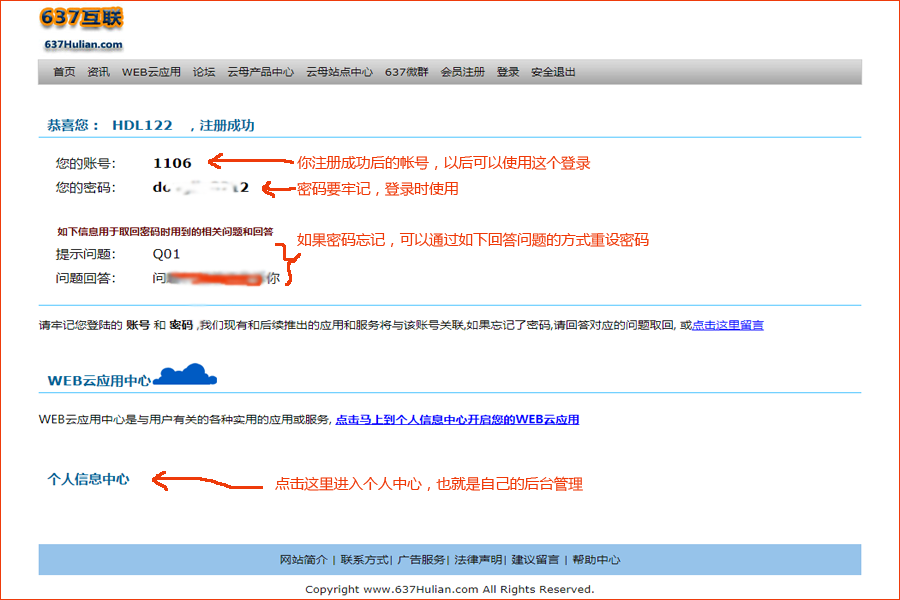 注册成功后即可,获得登录帐号,同时显示申请时设置的密码, 同时还有忘记密码时,通过回答问题来找回或重设密码的信息;