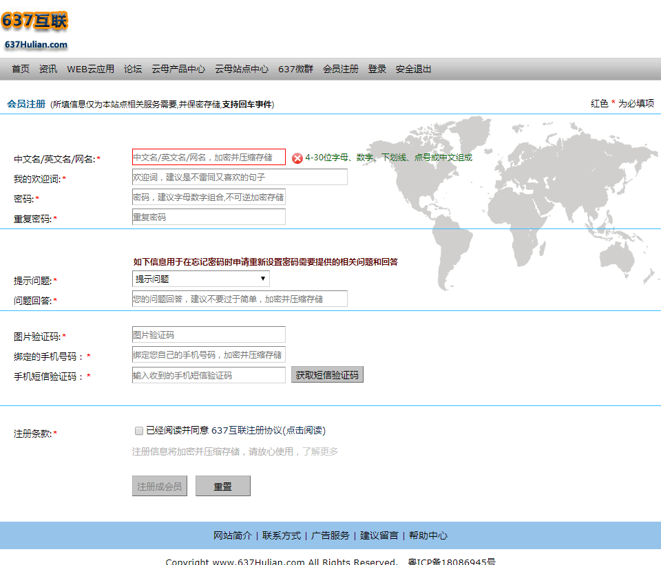二,点击主菜单上的 “会员注册”,进入注册页面,如下图: